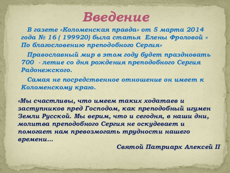 года № 16 ( 199920) была статья Елены Фроловой « По благословению преподобного Сергия»