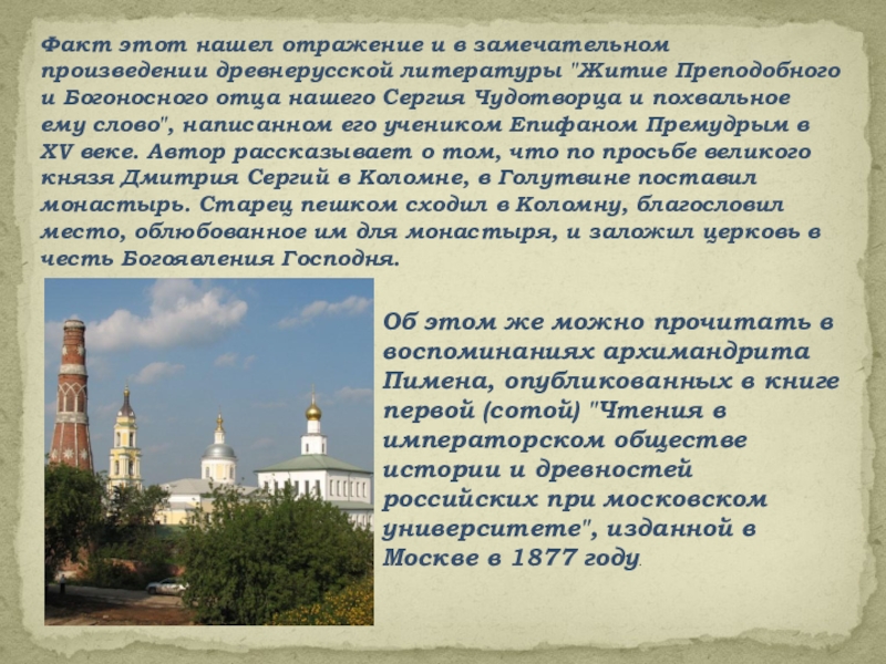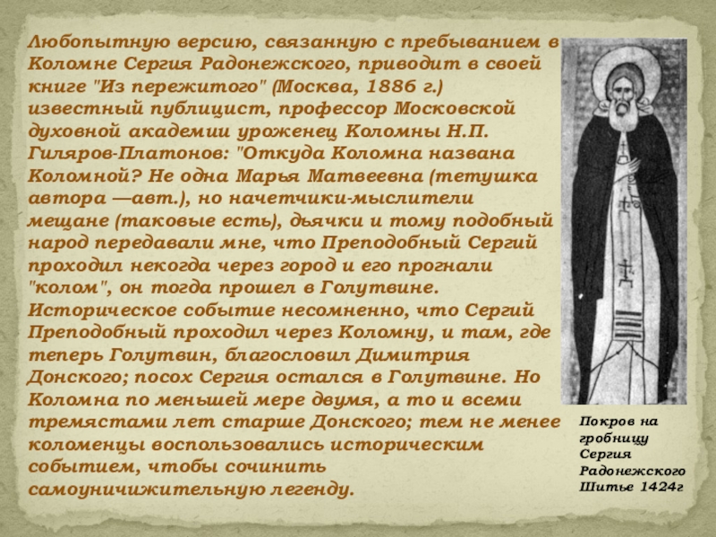 Слайд 13Любопытную версию, связанную с пребыванием в Коломне Сергия Радонежского, приводит в