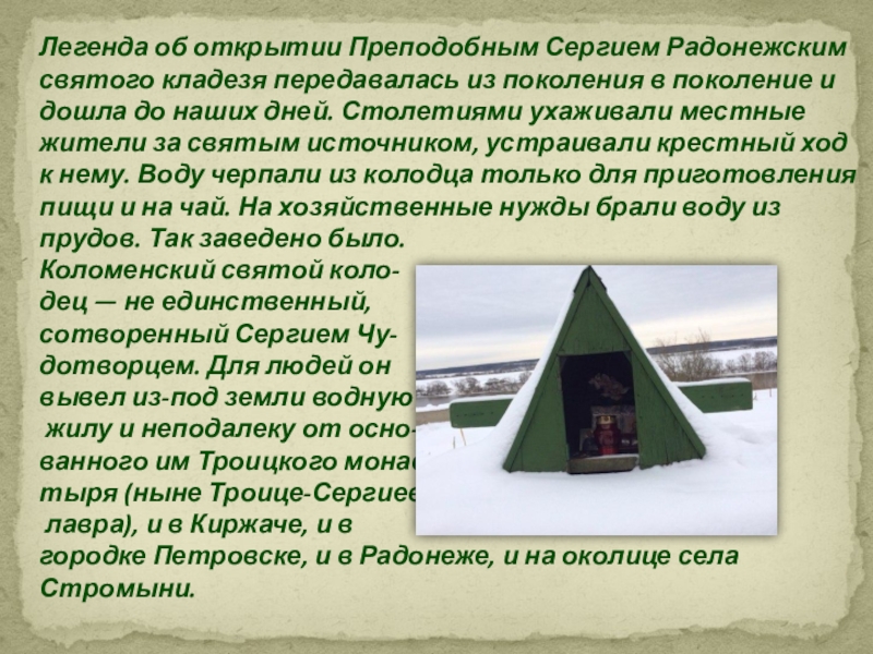 Слайд 6Легенда об открытии Преподобным Сергием Радонежским святого кладезя передавалась из поколения