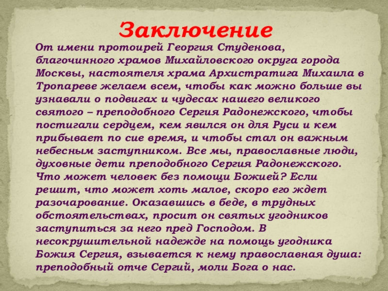 города Москвы, настоятеля храма Архистратига Михаила в Тропареве желаем всем, чтобы как можно больше вы узнавали о подвигах и чудесах нашего великого святого – преподобного Сергия Радонежского, чтобы постигали сердцем, кем явился он для Руси и кем прибывает по сие время, и чтобы стал он важным небесным заступником. Все мы, православные люди, духовные дети преподобного Сергия Радонежского. Что может человек без помощи Божией? Если решит, что может хоть малое, скоро его ждет разочарование. Оказавшись в беде, в трудных обстоятельствах, просит он святых угодников заступиться за него пред Господом. В несокрушительной надежде на помощь угодника Божия Сергия, взывается к нему православная душа: преподобный отче Сергий, моли Бога о нас.