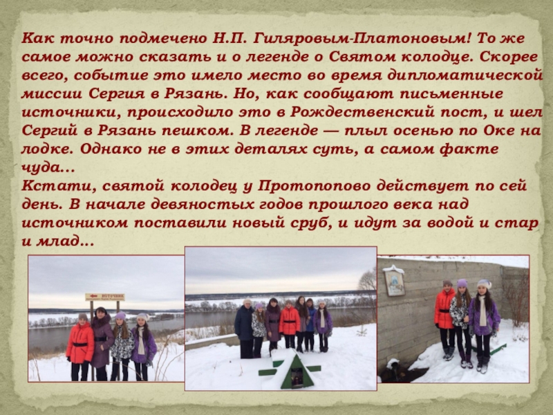 о легенде о Святом колодце. Скорее всего, событие это имело место во время дипломатической миссии Сергия в Рязань. Но, как сообщают письменные источники, происходило это в Рождественский пост, и шел Сергий в Рязань пешком. В легенде — плыл осенью по Оке на лодке. Однако не в этих деталях суть, а самом факте чуда...