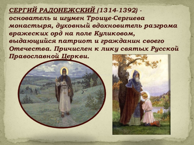 Слайд 5СЕРГИЙ РАДОНЕЖСКИЙ (1314-1392) - основатель и игумен Троице-Сергиева монастыря, духовный вдохновитель