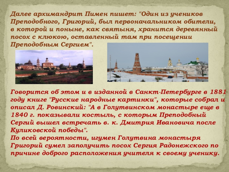 Говорится об этом и в изданной в Санкт-Петербурге в 1881 году книге "Русские народные картинки", которые собрал и описал Д. Ровинский: "А в Голутвинском монастыре еще в 1840 г. показывали костыль, с которым Преподобный Сергий вышел встречать в. к. Дмитрия Ивановича после Куликовской победы".
