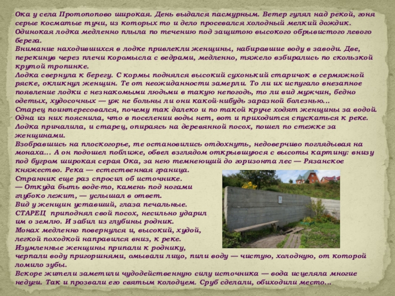 Слайд 7Ока у села Протопопово широкая. День выдался пасмурным. Ветер гулял над