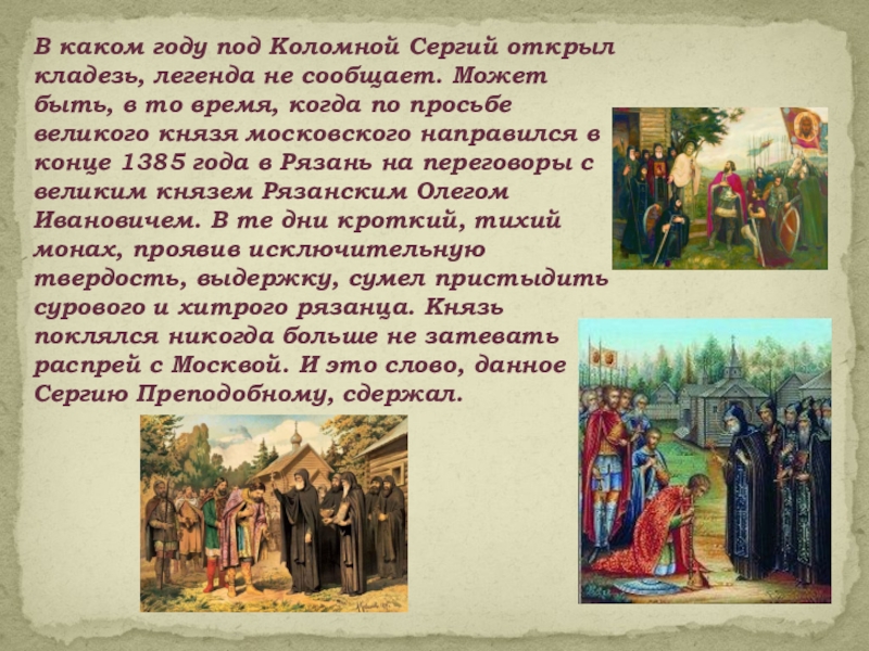 Слайд 8В каком году под Коломной Сергий открыл кладезь, легенда не сообщает.
