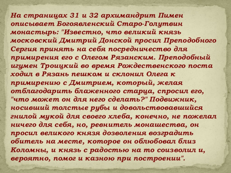 Слайд 11На страницах 31 и 32 архимандрит Пимен описывает Богоявленский Старо-Голутвин монастырь: