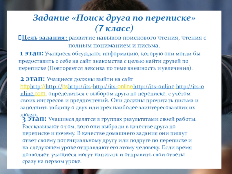 2 этап: Учащиеся должны выйти на сайт httphttp://http://itshttp://its-http://its-onlinehttp://its-online.http://its-online.com, определиться с выбором друга по переписке, с учётом своих интересов и предпочтений. Они должны прочитать письма и заполнить таблицу о двух или трех наиболее заинтересовавших их людях.