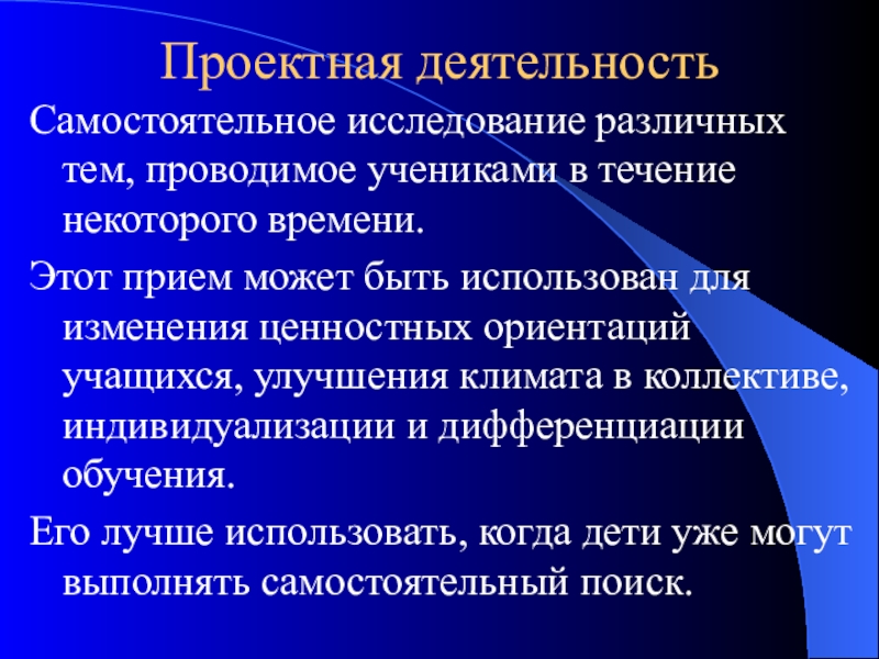 Самостоятельное исследование различных тем, проводимое учениками в течение некоторого времени.