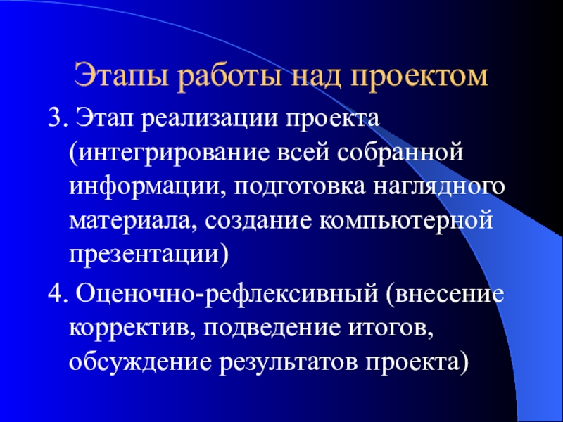 4. Оценочно-рефлексивный (внесение корректив, подведение итогов, обсуждение результатов проекта)