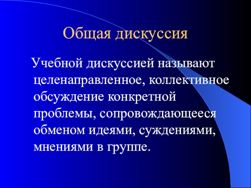 Учебной дискуссией называют целенаправленное, коллективное обсуждение конкретной проблемы, сопровождающееся