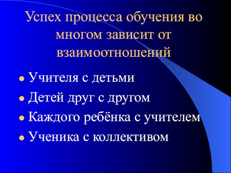 Слайд 7Успех процесса обучения во многом зависит от взаимоотношений