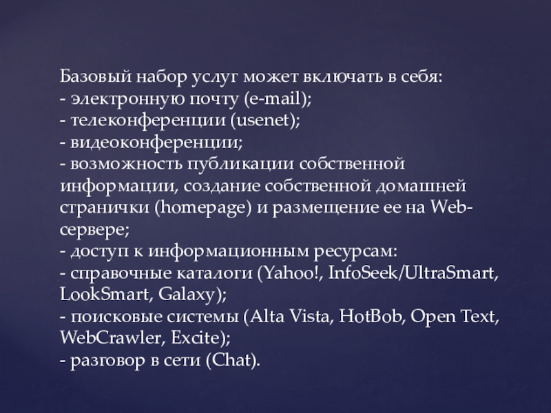 Базовый набор услуг может включать в себя: - электронную почту (e-mail);- телеконференции (usenet);- видеоконференции;- возможность публикации собственной