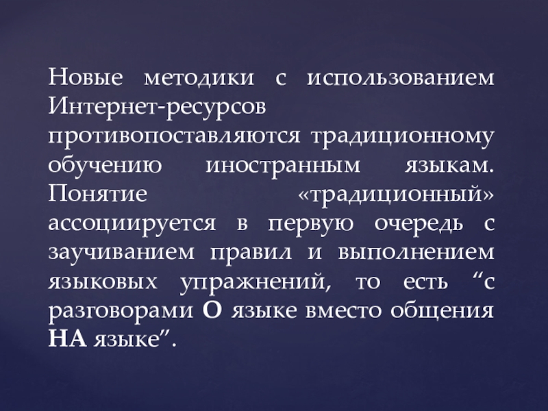 Слайд 8Новые методики с использованием Интернет-ресурсов противопоставляются традиционному обучению иностранным языкам. Понятие