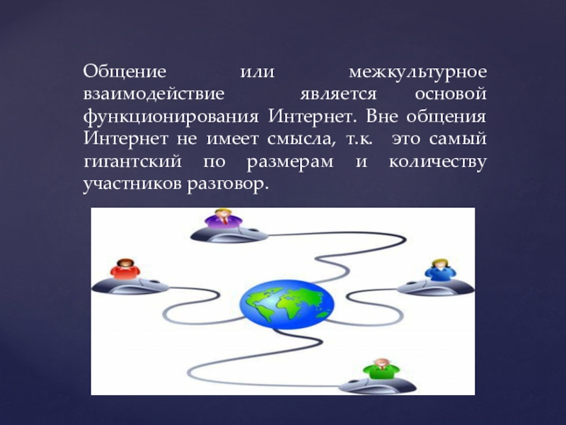 Слайд 3Общение или межкультурное взаимодействие является основой функционирования Интернет. Вне общения Интернет
