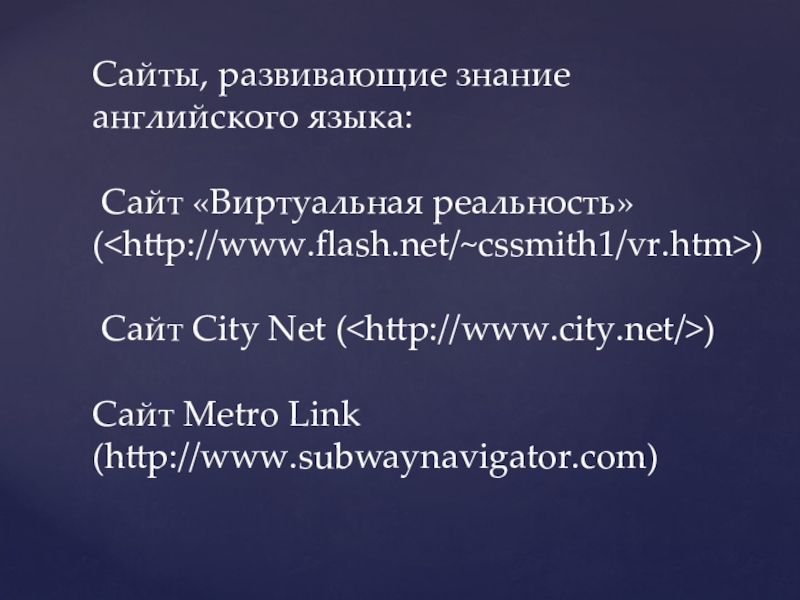 Сайты, развивающие знание английского языка: Сайт «Виртуальная реальность» () Cайт City Net () Сайт Metro Link (http://www.subwaynavigator.com)
