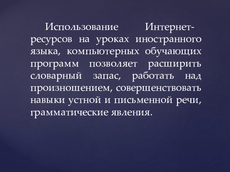 Использование Интернет- ресурсов на уроках иностранного языка, компьютерных обучающих программ позволяет расширить словарный запас, работать над произношением, совершенствовать навыки устной и письменной речи, грамматические явления.