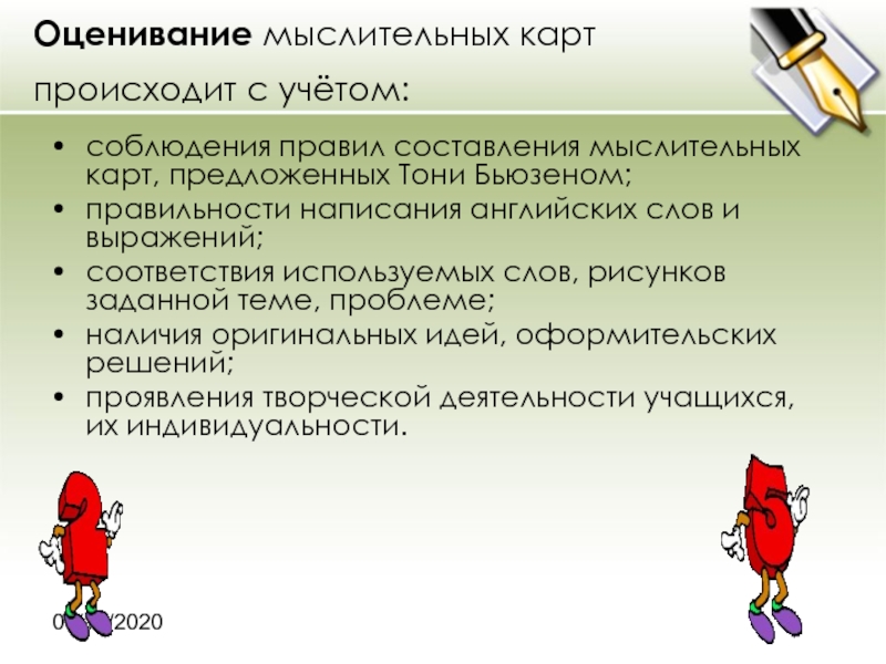 05/13/2020Оценивание мыслительных карт происходит с учётом: соблюдения правил составления мыслительных карт, предложенных Тони Бьюзеном;правильности написания английских слов