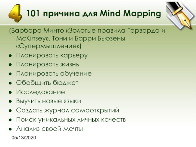05/13/2020101 причина для Mind Mapping(Барбара Минто «Золотые правила Гарварда и McKinsey», Тони и Барри Бьюзены «Супермышление»)Планировать карьеруПланировать