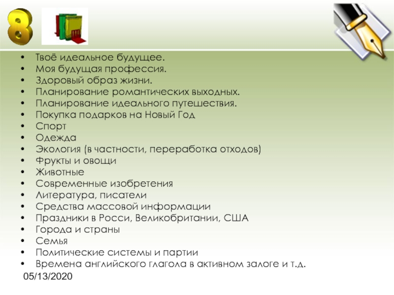 05/13/2020 Твоё идеальное будущее.Моя будущая профессия.Здоровый образ жизни.Планирование романтических выходных.Планирование идеального путешествия.Покупка подарков на Новый ГодСпортОдежда Экология