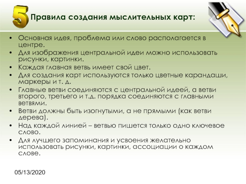 05/13/2020Правила создания мыслительных карт:Основная идея, проблема или слово располагается в центре.Для изображения центральной идеи можно использовать рисунки,