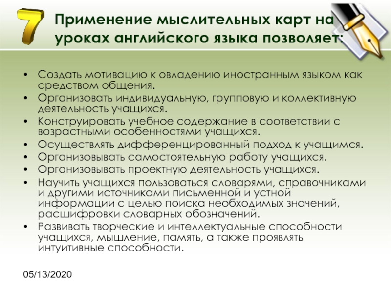 05/13/2020Применение мыслительных карт на уроках английского языка позволяет:Создать мотивацию к овладению иностранным языком как средством общения.Организовать индивидуальную,