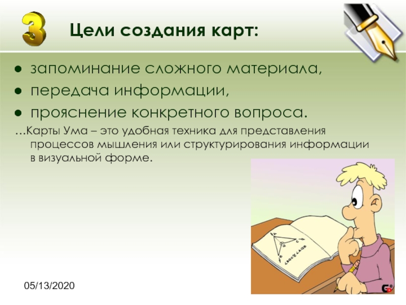 05/13/2020Цели создания карт:запоминание сложного материала,передача информации,прояснение конкретного вопроса.…Карты Ума – это удобная техника для представления процессов мышления