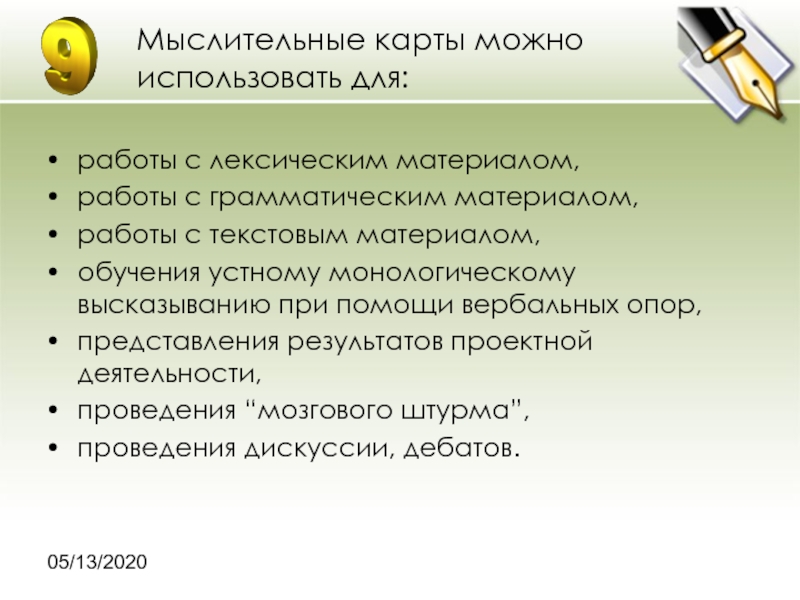 05/13/2020Мыслительные карты можно использовать для:работы с лексическим материалом,работы с грамматическим материалом,работы с текстовым материалом,обучения устному монологическому высказыванию