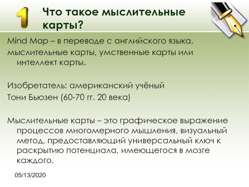 05/13/2020Что такое мыслительные карты?Mind Map – в переводе с английского языка, мыслительные карты, умственные карты или интеллект карты.Изобретатель: американский учёный Тони Бьюзен (60-70 гг. 20 века)Мыслительные карты – это графическое выражение процессов многомерного мышления, визуальный метод,