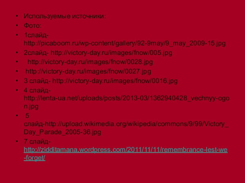 Используемые источники:Фото: 1слайд- http://picaboom.ru/wp-content/gallery/92-9may/9_may_2009-15.jpg2слайд- http://victory-day.ru/images/fnow/005.jpg http://victory-day.ru/images/fnow/0028.jpg http://victory-day.ru/images/fnow/0027.jpg3 слайд- http://victory-day.ru/images/fnow/0016.jpg4 слайд- http://lenta-ua.net/uploads/posts/2013-03/1362940428_vechnyy-ogon.jpg 5 слайд-http://upload.wikimedia.org/wikipedia/commons/9/99/Victory_Day_Parade_2005-36.jpg7 слайд- http://zidditamana.wordpress.com/2011/11/11/remembrance-lest-we-forget/8 слайд- http://www.guardian.co.uk/uk/gallery/2012/nov/11/remembrance-day-uk-pictures=3991994669