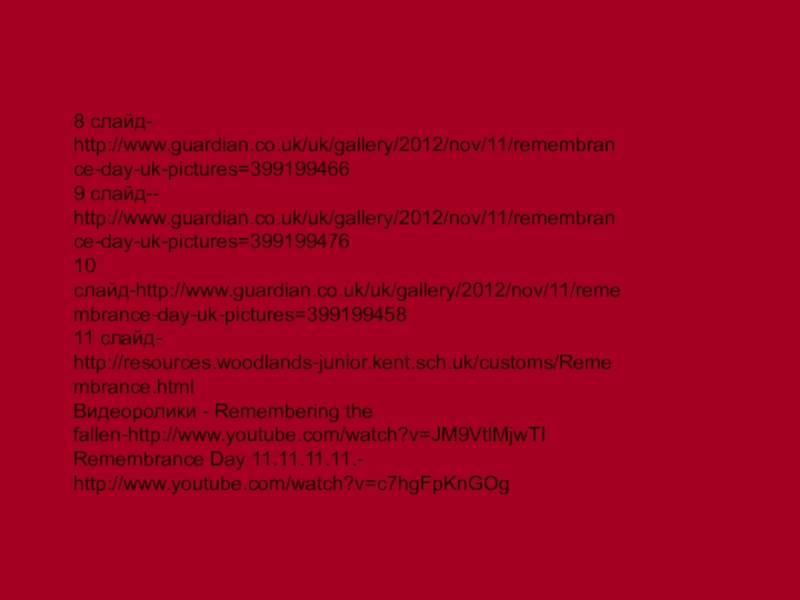 8 слайд- http://www.guardian.co.uk/uk/gallery/2012/nov/11/remembrance-day-uk-pictures=3991994669 cлайд-- http://www.guardian.co.uk/uk/gallery/2012/nov/11/remembrance-day-uk-pictures=39919947610 слайд-http://www.guardian.co.uk/uk/gallery/2012/nov/11/remembrance-day-uk-pictures=39919945811 слайд- http://resources.woodlands-junior.kent.sch.uk/customs/Remembrance.htmlВидеоролики - Remembering the fallen-http://www.youtube.com/watch?v=JM9VtlMjwTIRemembrance Day 11.11.11.11.- http://www.youtube.com/watch?v=c7hgFpKnGOg