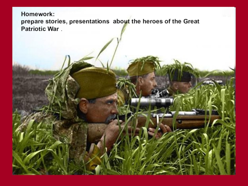 Homework:prepare stories, presentations about the heroes of the Great Patriotic War .