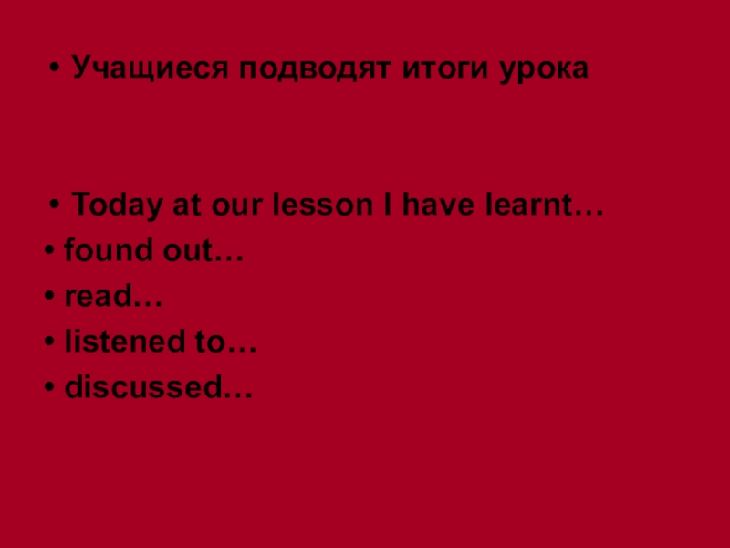 Учащиеся подводят итоги урокаToday at our lesson I have learnt… • found out… • read… • listened