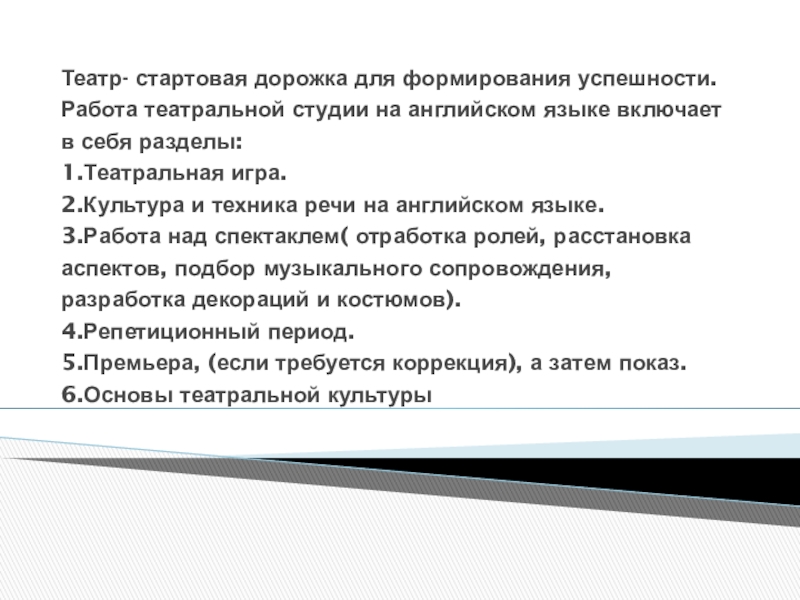 Театр- стартовая дорожка для формирования успешности. Работа театральной студии на английском языке включает в себя разделы: 1.Театральная