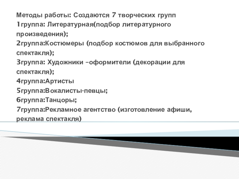 Методы работы: Создаются 7 творческих групп 1группа: Литературная(подбор литературного произведения); 2группа:Костюмеры (подбор костюмов для выбранного спектакля); 3группа: