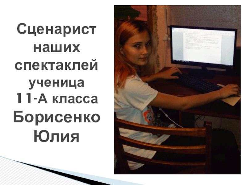 Слайд 13Сценарист наших спектаклей ученица 11-А класса Борисенко Юлия