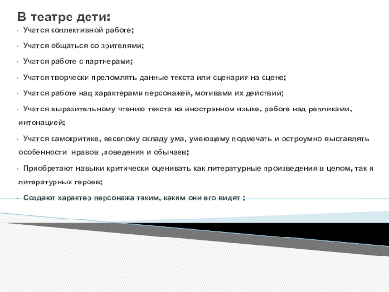 В театре дети:  Учатся коллективной работе; Учатся общаться со зрителями; Учатся работе с партнерами; Учатся творчески