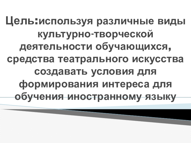 Цель:используя различные виды культурно-творческой деятельности обучающихся, средства театрального искусства создавать условия для формирования интереса для обучения иностранному