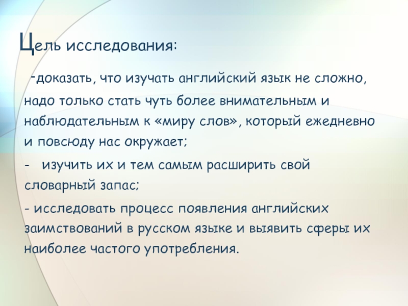 – исследование английских заимствований в современном русском языке последних десятилетий.
