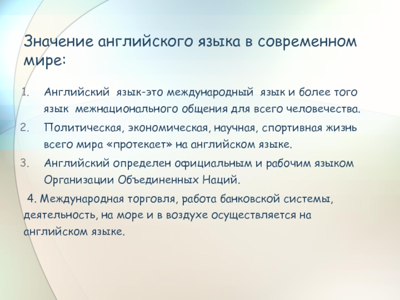 Владея этим языком международного общения, вы сможете достичь поставленных целей с помощью новых возможностей. И вы обязательно поймете, что значение английского языка не преувеличено.