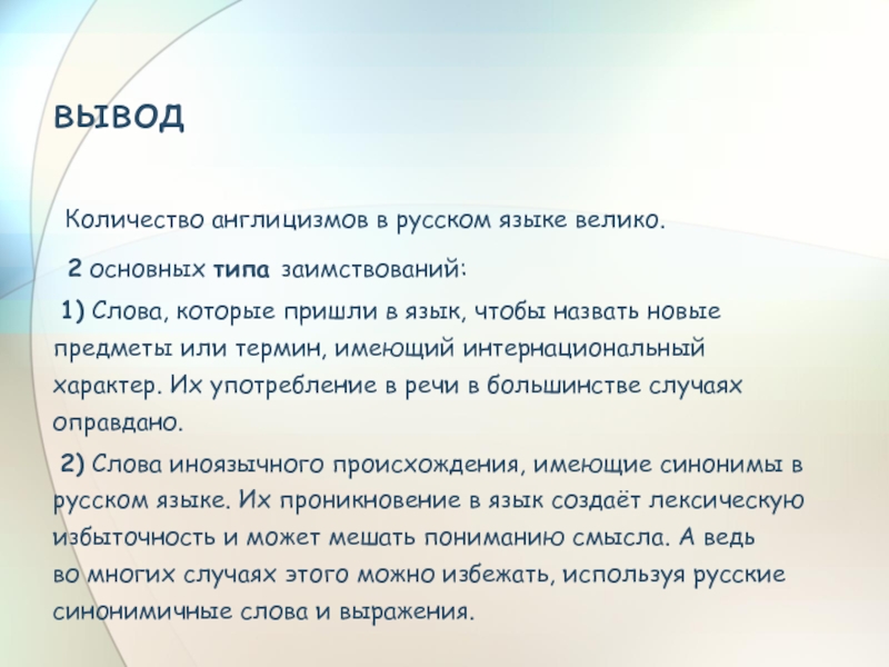 2) Слова иноязычного происхождения, имеющие синонимы в русском языке. Их проникновение в язык создаёт лексическую избыточность и может мешать пониманию смысла. А ведь во многих случаях этого можно избежать, используя русские синонимичные слова и выражения.