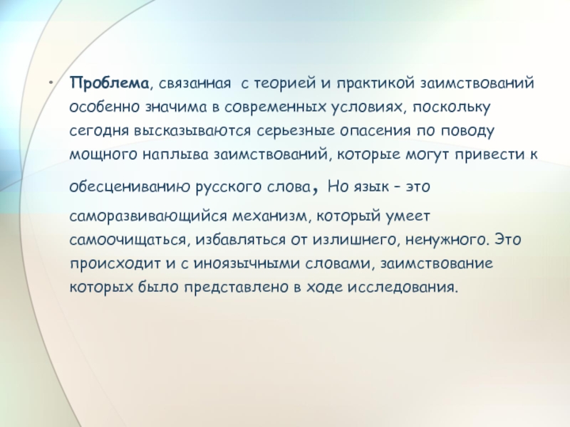 Слайд 19Проблема, связанная с теорией и практикой заимствований особенно значима в современных