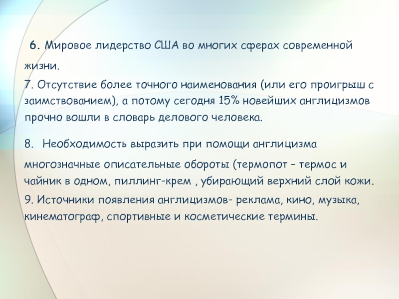 8. Необходимость выразить при помощи англицизма многозначные описательные обороты (термопот – термос и чайник в одном, пиллинг-крем , убирающий верхний слой кожи.