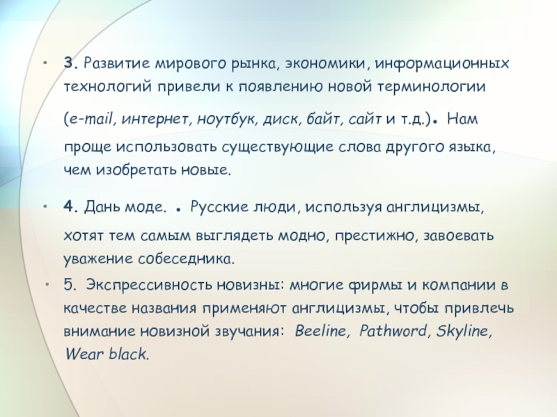 4. Дань моде. . Русские люди, используя англицизмы, хотят тем самым выглядеть модно, престижно, завоевать уважение собеседника.