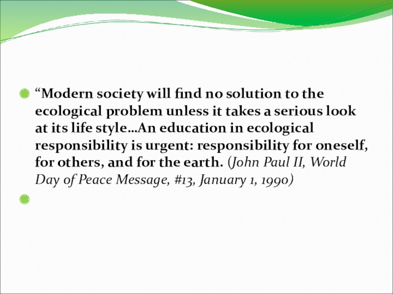 it takes a serious look at its life style…An education in ecological responsibility is urgent: responsibility for oneself, for others, and for the earth. (John Paul II, World Day of Peace Message, #13, January 1, 1990)
