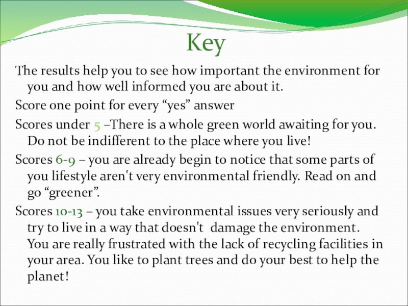 Scores 10-13 – you take environmental issues very seriously and try to live in a way that doesn't damage the environment. You are really frustrated with the lack of recycling facilities in your area. You like to plant trees and do your best to help the planet!