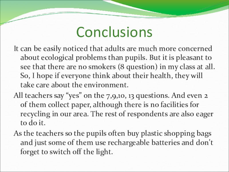 about ecological problems than pupils. But it is pleasant to see that there are no smokers (8 question) in my class at all. So, I hope if everyone think about their health, they will take care about the environment.