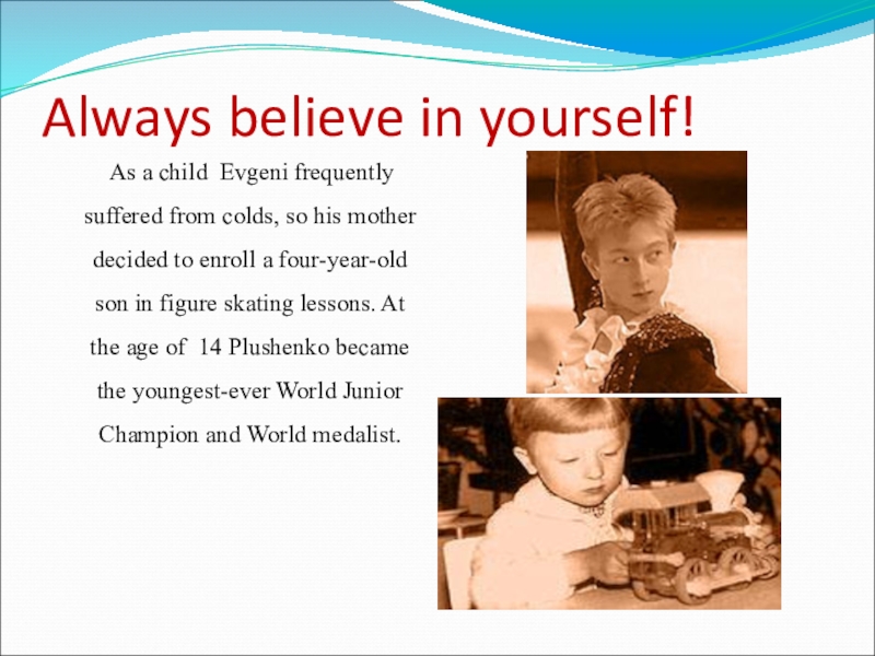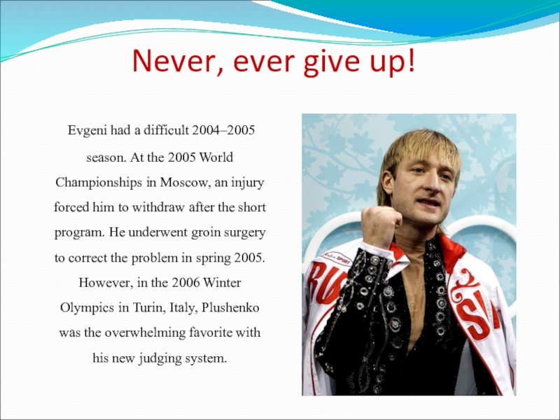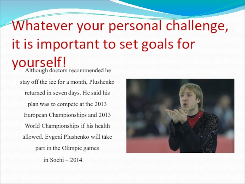 Although doctors recommended he stay off the ice for a month, Plushenko returned in seven days. He said his plan was to compete at the 2013 European Championships and 2013 World Championships if his health allowed. Evgeni Plushenko will take part in the Olimpic games