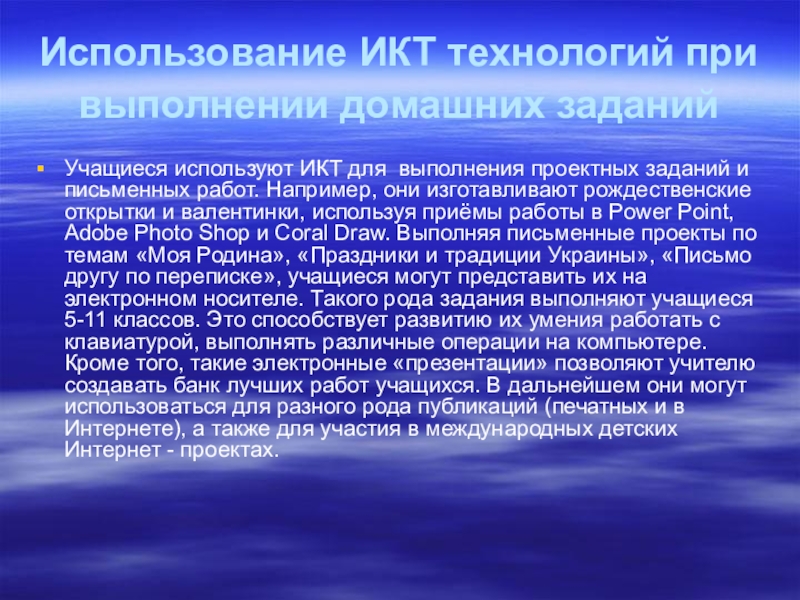 выполнения проектных заданий и письменных работ. Например, они изготавливают рождественские открытки и валентинки, используя приёмы работы в Power Point, Adobe Photo Shop и Coral Draw. Выполняя письменные проекты по темам «Моя Родина», «Праздники и традиции Украины», «Письмо другу по переписке», учащиеся могут представить их на электронном носителе. Такого рода задания выполняют учащиеся 5-11 классов. Это способствует развитию их умения работать с клавиатурой, выполнять различные операции на компьютере. Кроме того, такие электронные «презентации» позволяют учителю создавать банк лучших работ учащихся. В дальнейшем они могут использоваться для разного рода публикаций (печатных и в Интернете), а также для участия в международных детских Интернет - проектах.