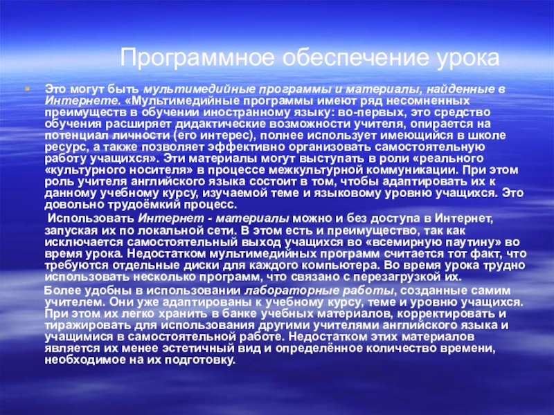 найденные в Интернете. «Мультимедийные программы имеют ряд несомненных преимуществ в обучении иностранному языку: во-первых, это средство обучения расширяет дидактические возможности учителя, опирается на потенциал личности (его интерес), полнее использует имеющийся в школе ресурс, а также позволяет эффективно организовать самостоятельную работу учащихся». Эти материалы могут выступать в роли «реального «культурного носителя» в процессе межкультурной коммуникации. При этом роль учителя английского языка состоит в том, чтобы адаптировать их к данному учебному курсу, изучаемой теме и языковому уровню учащихся. Это довольно трудоёмкий процесс.