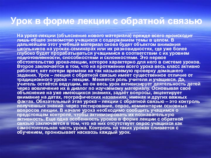 На уроке-лекции (объяснение нового материала) прежде всего происходит лишь общее знакомство учащихся с содержанием темы в целом. В дальнейшем этот учебный материал снова будет объектом внимания школьников на уроках-семинарах или их разновидностях, где уже более глубоко будет прорабатываться учащимися в соответствии с их уровнем подготовленности, способностями и склонностями. Это первое обстоятельство урока-лекции, которое характерно для него в системе уроков. Второе заключается в том, что на протяжении всего урока весь класс активно работает, нет потери времени на так называемую проверку домашнего задания. Урок – лекция с обратной связью имеет существенное отличие от традиционного урока – лекции. Меняется роль учителя и учащихся. Да, учитель остаётся ведущим, но он весь урок активизирует деятельность детей через вовлечение их в диалог по изучаемому материалу. Основывая своё объяснение на уже имеющихся знаниях, задаёт вопросы, акцентирует внимание на датах, географических названиях, именах и других важных фактах. Обязательный этап урока – лекции с обратной связью – это контроль полученных знаний через тестирование, опрос, комментарии основных вопросов лекции. В начале урока необходимо сообщить учащимся о предстоящем контроле, чтобы активизировать их познавательную активность. Еще одна особенность уроков в форме лекции с обратной связью заключается в том, что на них отсутствует опрос учащихся как самостоятельная часть урока. Контроль на таких уроках сливается с обучением, пронизывает насквозь каждый урок.